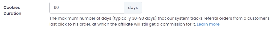 Cookie Duration is the maximum number of days (typically 30-90 days) between the last click and the order, at which the affiliate will get a commission for the referral order. As long as that customer uses the same device and browser, and no other affiliate link or coupon is used when the order is placed, the cookie won't be overwritten and will give the respective affiliate a commission!